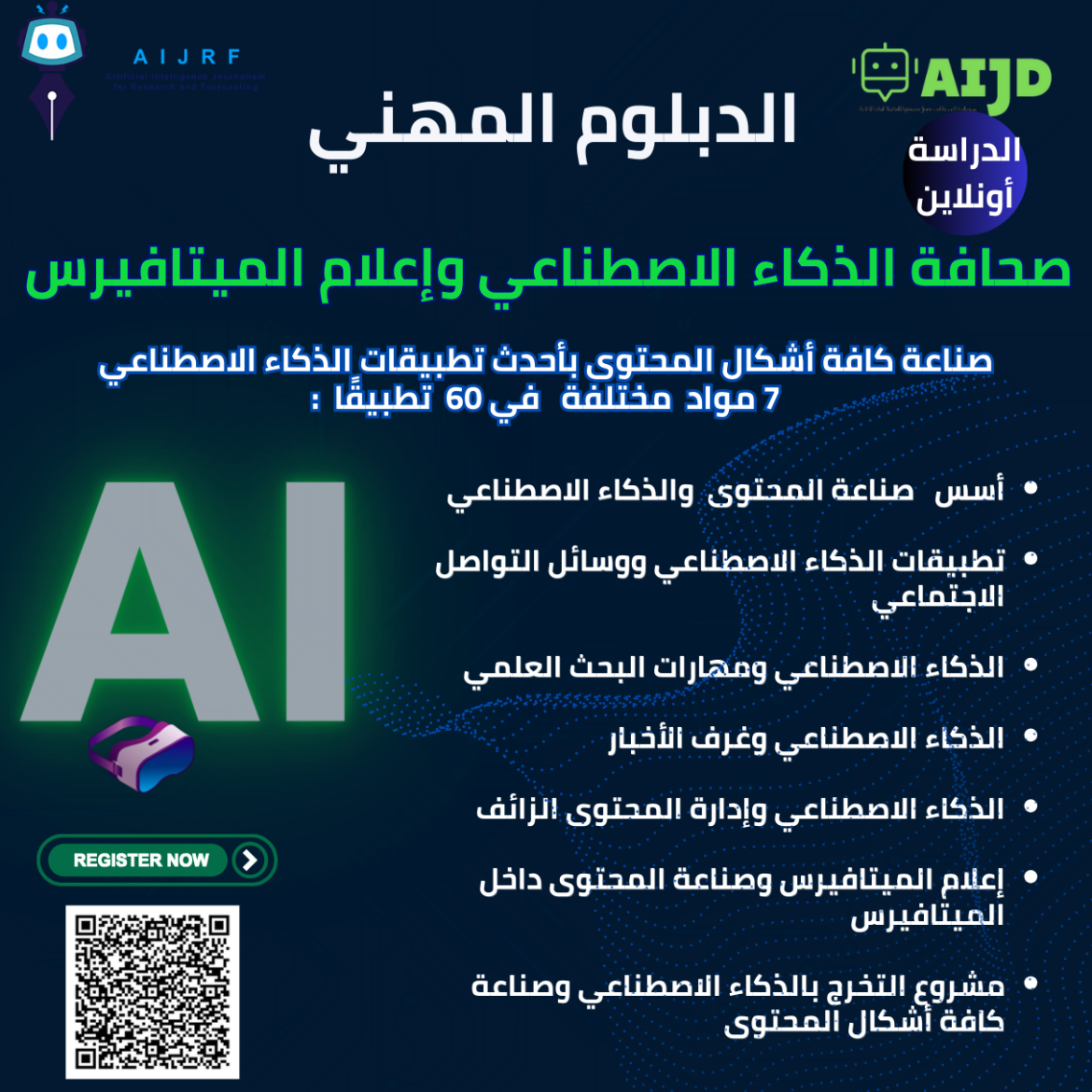 أول دبلوم مهني تطبيقي مُتخصص، تم الإعلان عن دورته الاولى في نوفمبر 2022، ويقدم كل 3 أشهر دورة مختلفة ومتطورة ومحدثة، يتعلم الدارسون فيه أكثر من 50 تطبيقا من تطبيقات الذكاء الاصطناعي في صناعة وإدارة كافة أشكال المحتوى الإعلامي عبر منصات: الأخبار، التواصل الاجتماعي، منصات الخدمات الحكومية، منصات الأبحاث والدراسات العلمية والأكاديمية.