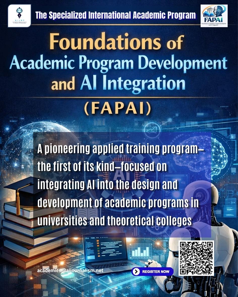 The Artificial Intelligence Journalism for Research and Forecasting (AIJRF) has announced the launch of the Specialized International Academic Program : Foundations of Academic Program Development and AI Integration (FAPAI) training program, a first-of-its-kind specialized applied program, developed in collaboration with the American Institute for International Accreditation in Media Technologies (AIAMT) and the Arab Index for Artificial Intelligence in Universities at the University of Dubai.