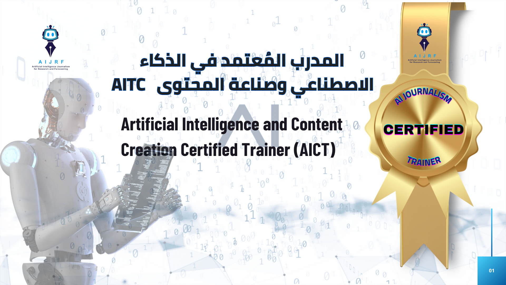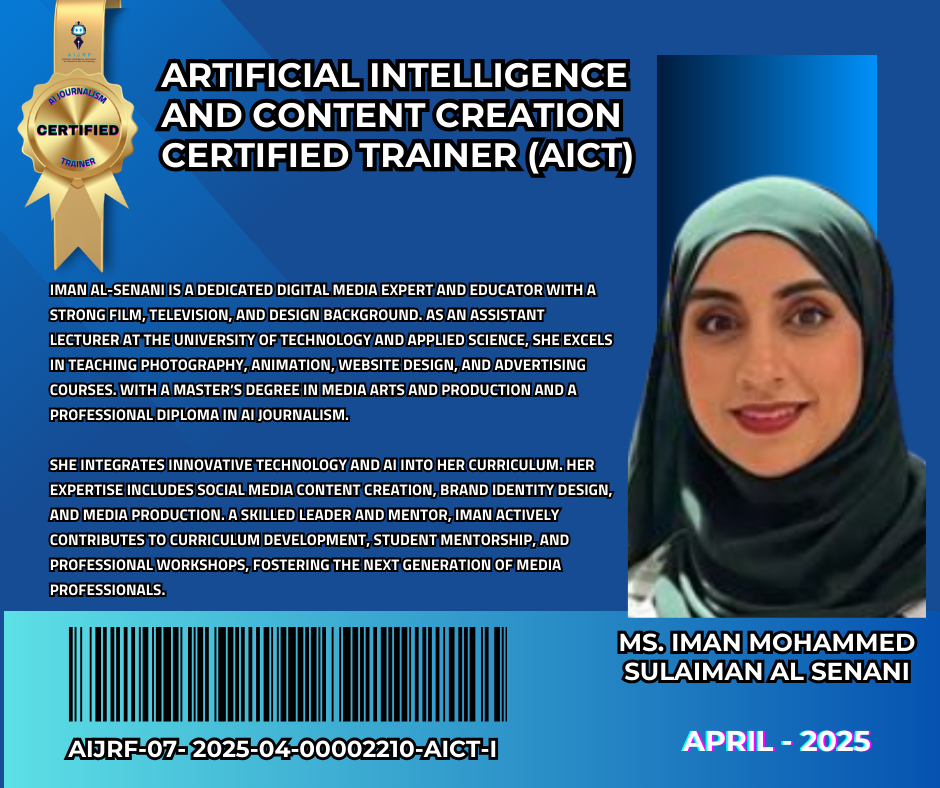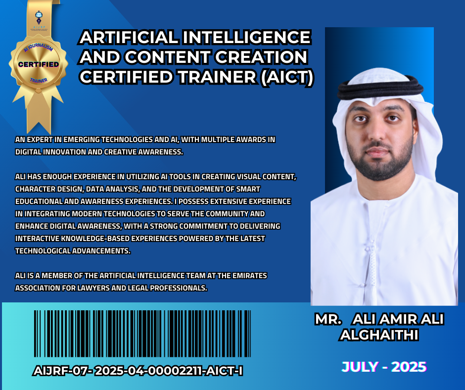 Earn a certification as a trainer in Artificial Intelligence and Content Creation” from Artificial Intelligence Journalism for Research and Forecasting (AIJRF) , the global leader foundation in media content, artificial intelligence, and the Metaverse, according to the following conditions: