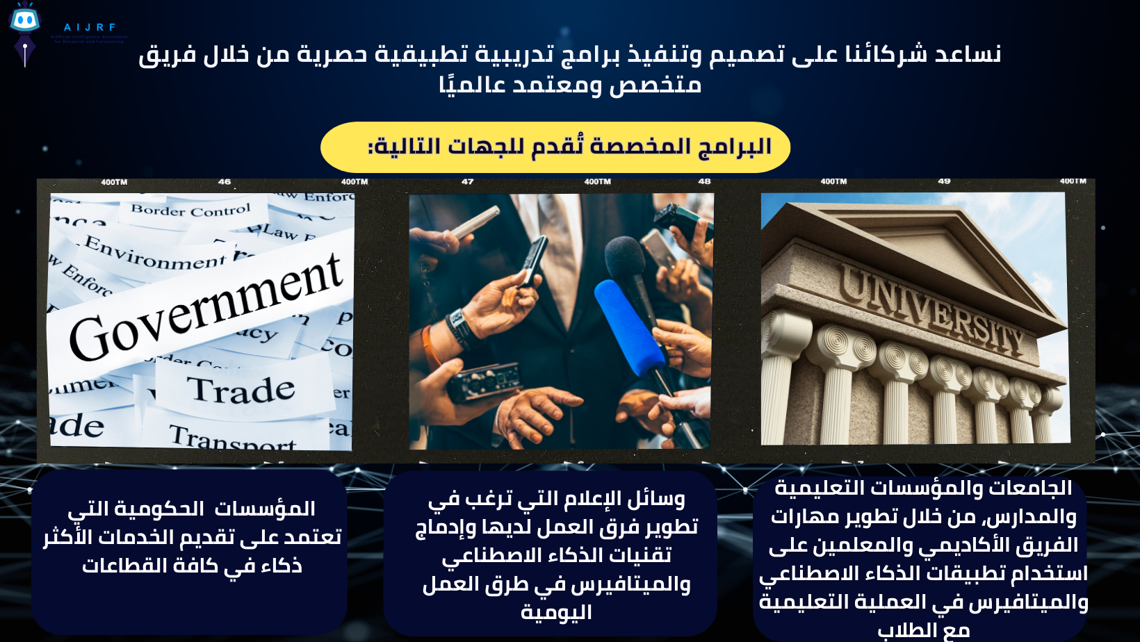 by AIJ Varit Bookmark أسس بناء البرامج التعليمية الأكاديمية ودمج أدوات وتقنيات الذكاء الاصطناعي (FAPAI) Bookmark جامعة دبي ومؤسسة AIJRF يُطلقان النسخة السادسة من المنتدى العالمي لصحافة الذكاء... Bookmark دبلوم الذكاء الاصطناعي وصناعة المحتوى القصصي التفاعلي للأطفال (AISCC) Bookmark الدبلوم المهني: صحافة الذكاء الاصطناعي AIJD Bookmark مؤسسة صحافة الذكاء الاصطناعي ومعهد اليوم للتدريب يُنفذان 3 برامج تدريبية تطبيقية... Bookmark مؤسسة ( AIJRF ) : 20 مبادرة عالمية وأكثر من 120 برنامج... Bookmark الولايات المتحدة تطلق العنان للذكاء الاصطناعي Bookmark الرئيس التنفيذي لـ AIJRF : نمو استثمارات الذكاء الاصطناعي خليجا إلى أكثر... Bookmark الرئيس التنفيذي لمؤسسة AIJRF: التشريعات الديناميكية والمنظومة الابتكارية تقود نمو الذكاء الاصطناعي... Bookmark مؤسسة صحافة الذكاء الاصطناعي شريك في برنامج “صُنّاع المحتوى الصحي والعلمي” الثورة الصناعية الرابعة Bookmark أسس بناء البرامج التعليمية الأكاديمية ودمج أدوات وتقنيات الذكاء الاصطناعي (FAPAI) by Mohamedai2020 by Mohamedai2020 Bookmark مؤسسة صحافة الذكاء الاصطناعي ومعهد اليوم للتدريب يُنفذان 3 برامج تدريبية تطبيقية في الذكاء الاصطناعي by Mohamedai2020 Bookmark الولايات المتحدة تطلق العنان للذكاء الاصطناعي by Abass Bookmark الرئيس التنفيذي لـ AIJRF : نمو استثمارات الذكاء الاصطناعي خليجا إلى أكثر من 250 مليار دولار حتى 2035 by Mohamedai2020 دراسات وأبحاث Bookmark أسس بناء البرامج التعليمية الأكاديمية ودمج أدوات وتقنيات الذكاء الاصطناعي (FAPAI) by Mohamedai2020 by Mohamedai2020 Bookmark دبلوم الذكاء الاصطناعي وصناعة المحتوى القصصي التفاعلي للأطفال (AISCC) by Mohamedai2020 by Mohamedai2020 Bookmark مؤسسة ( AIJRF ) : 20 مبادرة عالمية وأكثر من 120 برنامج تدريبي وتعاون مع 30 مؤسسة تعليمية وتطبيقية عالمية ومحلية خلال 7 سنوات by Mohamedai2020 Bookmark الولايات المتحدة تطلق العنان للذكاء الاصطناعي by Abass تواصل معنا Facebook Twitter Instagram Linkedin Youtube أهم الموضوعات Bookmark أسس بناء البرامج التعليمية الأكاديمية ودمج أدوات وتقنيات الذكاء الاصطناعي (FAPAI) Bookmark جامعة دبي ومؤسسة AIJRF يُطلقان النسخة السادسة من المنتدى العالمي لصحافة الذكاء الاصطناعي في أبريل 2026 Bookmark دبلوم الذكاء الاصطناعي وصناعة المحتوى القصصي التفاعلي للأطفال (AISCC) Bookmark الدبلوم المهني: صحافة الذكاء الاصطناعي AIJD تطبيقات الذكاء الاصطناعي Bookmark دبلوم الذكاء الاصطناعي وصناعة المحتوى القصصي التفاعلي للأطفال (AISCC) by Mohamedai2020 by Mohamedai2020 Bookmark مؤسسة صحافة الذكاء الاصطناعي ومعهد اليوم للتدريب يُنفذان 3 برامج تدريبية تطبيقية في الذكاء الاصطناعي by Mohamedai2020 Bookmark الولايات المتحدة تطلق العنان للذكاء الاصطناعي by Abass أحداث ومؤتمرات Bookmark الولايات المتحدة تطلق العنان للذكاء الاصطناعي by Abass by Abass Bookmark الجامعة الأميركية في الشارقة تستضيف النسخة الخامسة من المنتدى العالمي لصحافة الذكاء الاصطناعي 2025 by Mohamedai2020 Bookmark مؤسسة AIJRF شريك رئيسي للمنتدى الدولي للاتصال الحكومي في عدة فعاليات by eldmrani احصل على نسختك! تواصل معنا الآن! مهن المستقبل Bookmark مؤسسة صحافة الذكاء الاصطناعي تفتح الباب لعضوية المنتسبين للباحثين والإعلاميين by Mohamedai2020 Bookmark أطلق العنان لمستقبلك مع منح فولبرايت لسنة 2025-2024 by Abass Bookmark مؤسسة صحافة الذكاء الاصطناعي تُشارك في ندوة حول الذكاء الاصطناعي والإعلام by Mohamedai2020 Bookmark سيمنار شهري لمناقشة البحوث والأطروحات العلمية في مجال الإعلام والذكاء الاصطناعي by Mohamedai2020 Bookmark ورشتي عمل في استخدام تقنيات صحافة الذكاء الاصطناعي بالتعاون مع قناة العربية ومجموعة نرويجية متخصصة by Mohamedai2020 الأقسام الذكاء الاصطناعي الثورة الصناعية الرابعة تطبيقات الذكاء الاصطناعي تقارير ومتابعات صحافة الذكاء الاصطناعي دراسات وأبحاث آخر الموضوعات Bookmark روبوتات تواجه كورونا بالأشعة فوق البنفسجية في محطات... by asmaa by asmaa Read more Bookmark أكثر من 1300 مرشح للدورة التدريبية الأولى في... by asmaa by asmaa Read more Bookmark الذكاء الاصطناعي يحمي رواد